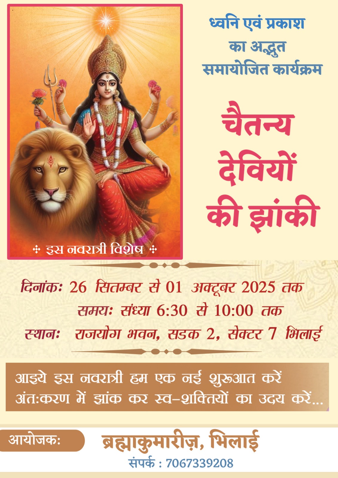 भिलाई,29सितंबर2025, छत्तीसगढ़ :- प्रजापिता ब्रह्माकुमारी ईश्वरीय विश्व विद्यालय सेक्टर 7 राजयोग भवन द्वारा नवरात्रि के पावन अवसर पर  ध्वनि एवं प्रकाश के अति सुंदर समायोजन द्वारा चैतन्य देवियों की झांकी भक्तों के आकर्षण का केंद्र बनी हुई है।
