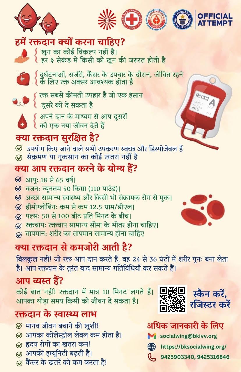 ब्रह्माकुमारीज एवं राजयोग एजुकेशन एंड रिसर्च फाउंडेशन (RE&RF) के समाज सेवा प्रभाग द्वारा सम्पूर्ण भारत के 6000 से अधिक सेवाकेंद्रों पर एक लाख यूनिट से अधिक रक्तदान कर इसे गिनीज़ बुक ऑफ वर्ल्ड रिकॉर्ड्स में दर्ज करने का लक्ष्य है।